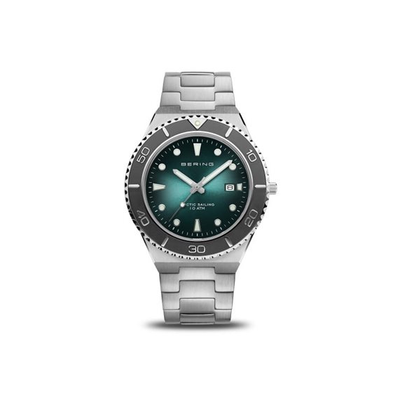 Arctic Sailing. Il vetro zaffiro antigraffio e il rivestimento in ioni metallici rendono il modello estremamente resistente all'acqua (10 atm). Un compagno ideale sia in mare che sulla terraferma. La cassa e il bracciale a maglie larghe sono realizzati in robusto acciaio inossidabile spazzolato, messo in risalto dalla lunetta girevole e dalle lancette e dagli indici illuminati che conferiscono a questo orologio un aspetto potente e sportivo. Un dettaglio nobile è il quadrante Sunray con datario, che brilla alla luce del giorno come il sole sul ghiaccio artico. Garanzia 3 anni.