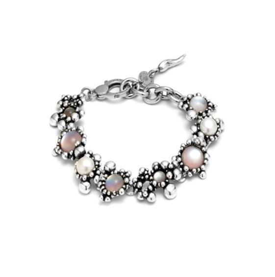 Bracciale Sunrise. L’argento brunito incontra il colore cangiante dell’alba, in un gioiello che evoca quell’atmosfera sospesa fatta di luce e tempo. La vita vera ha bisogno di sogni preziosi. Argento 925/°°°, perle naturali, madreperla rosa e verde doppiate con quarzo. Realizzato completamente a mano in azienda.