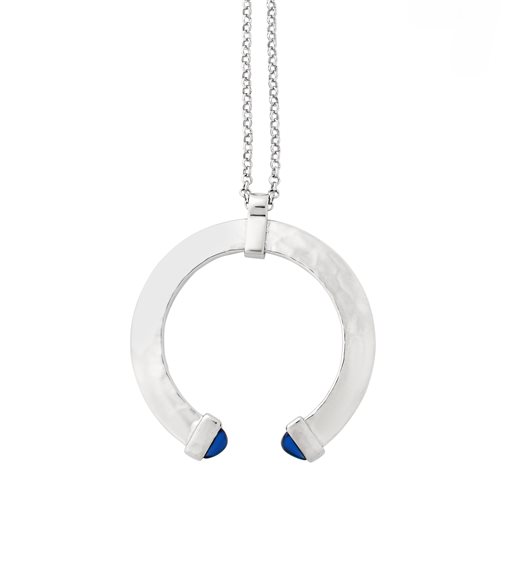 Pendente Blue Blade. Questo pendente, munito di catena in argento di cm.80, si distingue per un elegante gioco di volumi e riflessi, arricchito da un'energia cromatica unica. I cristalli rossi, luminosi e raffinati, impreziosiscono l'argento con un tocco di intensa lucentezza. Realizzato a mano in azienda.