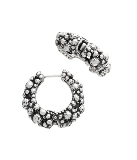 Orecchini Chérie Perlage. Giovanni Raspini si destreggia con eleganza e personalità progettando una creazione di assoluta contemporaneità. Questi orecchini a cerchio in argento brunito, con le sferette luminose che offrono una resa plastica di grandissimo effetto, si caratterizzano per la funzionalità dell'apertura a molla. Argento fuso con la tradizionale tecnica della cera persa, lavorato a mano completamente in azienda.