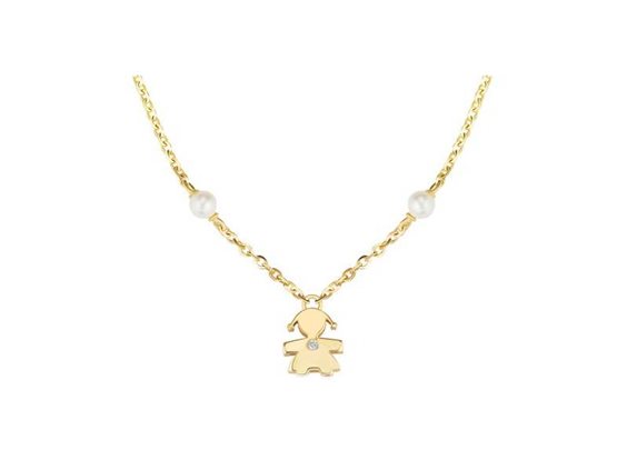 L’eleganza senza tempo. La sagoma Bimba incontrano la perla, simbolo di rinascita e purezza. Collana Bimbo in Oro Giallo 9 Kt con perle e diamante Perle da 3-3,5 mm