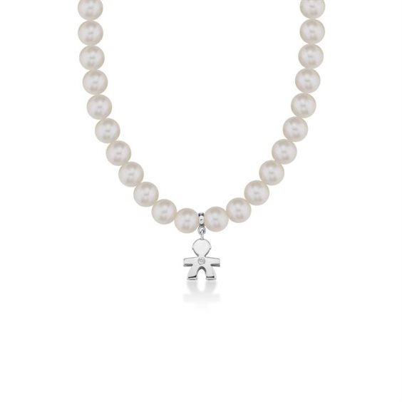 Collana perle cm. 42 Mm. 4.5-5 con sagoma maschietto in oro bianco con brillantino. Tutti i gioielli della linea le Bebé possono essere personalizzati.