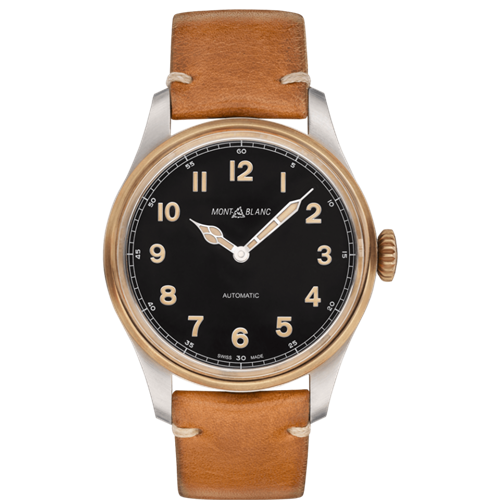 Il Montblanc 1858 Automatic con quadrante nero intenso fa risaltare alla perfezione le lancette a cattedrale e i numeri arabi evidenziati da Super-LumiNova® beige per consentire una lettura ottimale anche al buio. La cassa da 44 mm è in acciaio pregiato satinato, mentre la lunetta e la corona sono in bronzo. Il fondello rivela l’incisione della Manifattura Minerva di Villeret, con le montagne del Giura sullo sfondo.