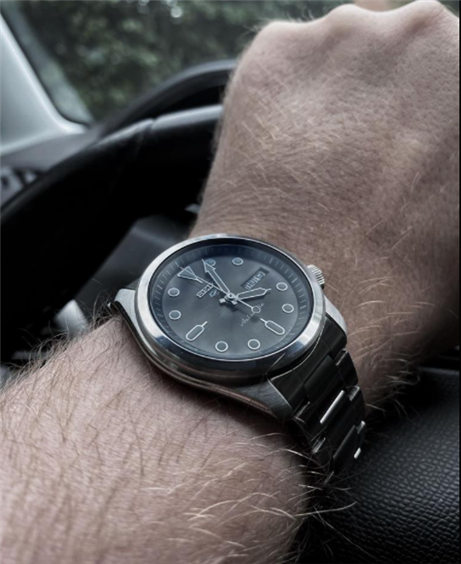 rologio automatico da uomo Seiko 5 Sports ref. SRPE51K1 "Solid Boy". Cassa da 40 mm in acciaio inossidabile con corona ad ore 4. Quadrante fumè con indici luminescenti, datario e giorno della settimana. Fondello a vite con movimento a vista. Bracciale in acciaio da mm 20 con tripla chiusura pieghevole con blocco di sicurezza. Movimento meccanico automatico calibro 4R36 con riserva di carica di 41 ore. Vetro Hardlex (vetro minerale temperato). Water resistant fino a 100 metri.