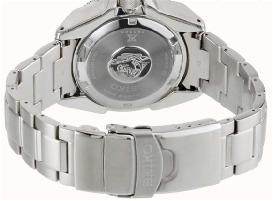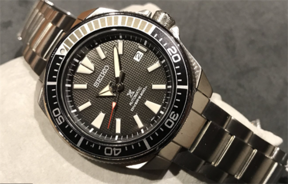 Orologio subacqueo professionale, movimento 4R35 a tre sfere e data 21600 alternanze/ora. 23 rubini, opzione carica manuale, riserva di carica oltre 41 ore. Bracciale in acciaio con estensione per muta, cassa SAMURAI in acciaio con vetro Hardlex brevetto SEIKO. Corona a vite, quadrante nero con indici e sfere con trattamento lumibrite per visione notturna. Ghiera girevole unidirezionale con trattamento IP nero e grigio.