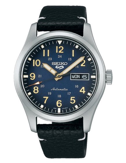 Orologio Seiko della Collezione 5 Sports Military con indicazione della data e del giorno e delle 24 ore, Movimento Automatico con fondello a vista, impermeabile fino a 10 BAR, 39,4mm di diametro, vetro Hardlex, cassa in acciaio, cinturino in Pelle di vitello.