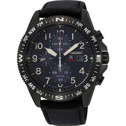 Questo orologio Seiko ha una cassa in colore ricoperto acciaio inossidabile con un diametro di 44 mm ed è dotato di un cinturino in Pelle. All'interno ha un movimento solar per orologi di qualità ed è finito con un vetro di tipo Hardlex Crystal. L'orologio è impermeabile a 20ATM. Questo significa che l'orologio è adatto a immersioni profonde.