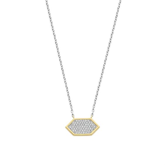 Questa collana d'argento TI SENTO 34040ZY colpisce con il suo luccicante pavé di pietre di zirconia cubica incorniciato in una accattivante forma geometrica abbracciata da una montatura placcata oro giallo, che dona un tocco caldo e lussuoso al gioiello. La collana è realizzata con grande cura in argento sterling 925 di alta qualità e placcata con un prezioso strato di platino che lo protegge e lo mantiene splendente a lungo. Questo è pezzo che non passa inosservato, sia indossato da solo che abbinato ad altre bellezze per un look più estroso. Brilla ad ogni movimento con questa accessorio glam e raffinato. Tutte le nostre collane sono prive di nickel e ipoallergeniche. La TI SENTO Collana 34040ZY è realizzata in Argento sterling color oro. Questa collana è di colore Zircone bianco con placcatura d'oro giallo. Ogni gioiello TI SENTO viene confezionato con amore e infinita cura in un bellissimo cofanetto regalo. La magia sta nel nostro argento. La lunghezza standard della collana è 38 cm. L'estensione di 10 cm, in dotazione, consente di poterla indossare in 5 diverse lunghezze: 38, 40, 42, 45 e 48 cm.