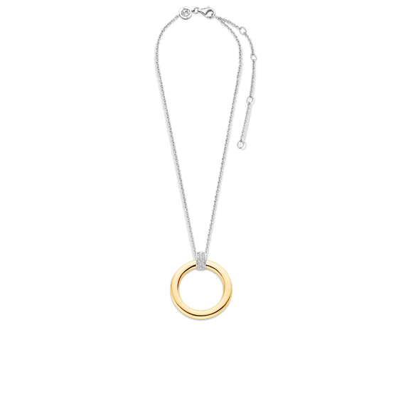 Collana in argento rolò lunga 48 cm con anellini finali per accorciarla. Ciondolo rotondo con zirconi placato oro giallo.