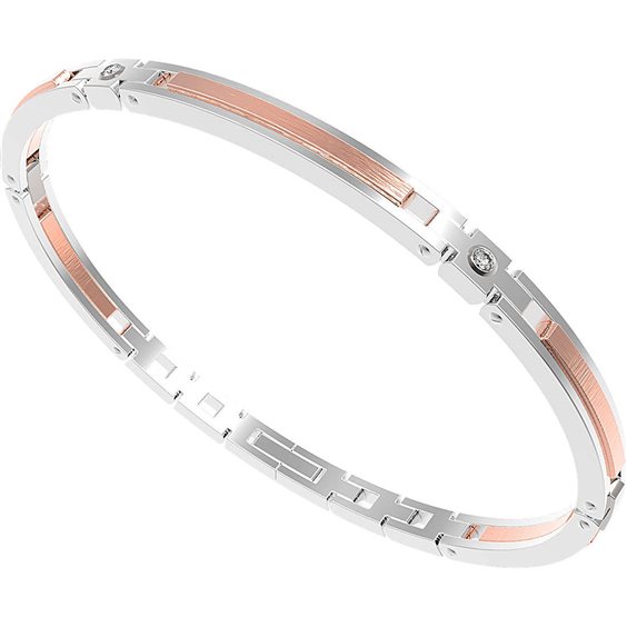 bracciale in acciaio, inserti in acciaio laminato oro rosa, inserti in zirconi naturali, chiusura a scatto, lunghezza totale 22,5 cm con possibilità di accorciarlo