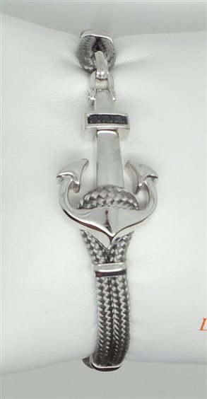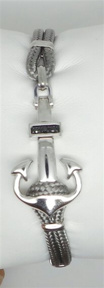 Bracciale unisex in argento con spinelli neri naturali, cotone cerato marino, chiusura in acciaio regolabile su tre livelli, lunghezza massima 21,5 cm, grandezza ancora 3X2 cm.