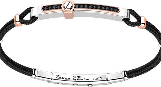 Bracciale uomo di Zancan della Collezione Rekord925. Gioiello in Argento 925 con barra centrale con incastonati spinelli neri. Argento 925 gr2.60 Oro Rosa 18Kt gr.1.80 Il bracciale è in corda Kevlar nera con chiusura in acciaio 316L. Lunghezza bracciale 21Cm. La chiusura è regolabile a scatto.